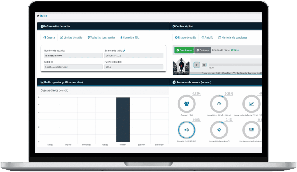 Cada emisora en nuestro servicio puede transmitir en vivo con la máxima calidad de acuerdo al plan activo. Además, te ofrecemos funciones de AutoDJ que automatizan la transmisión 24/7, así como estadísticas en tiempo real para mantenerte informado sobre el desempeño de tu emisora.